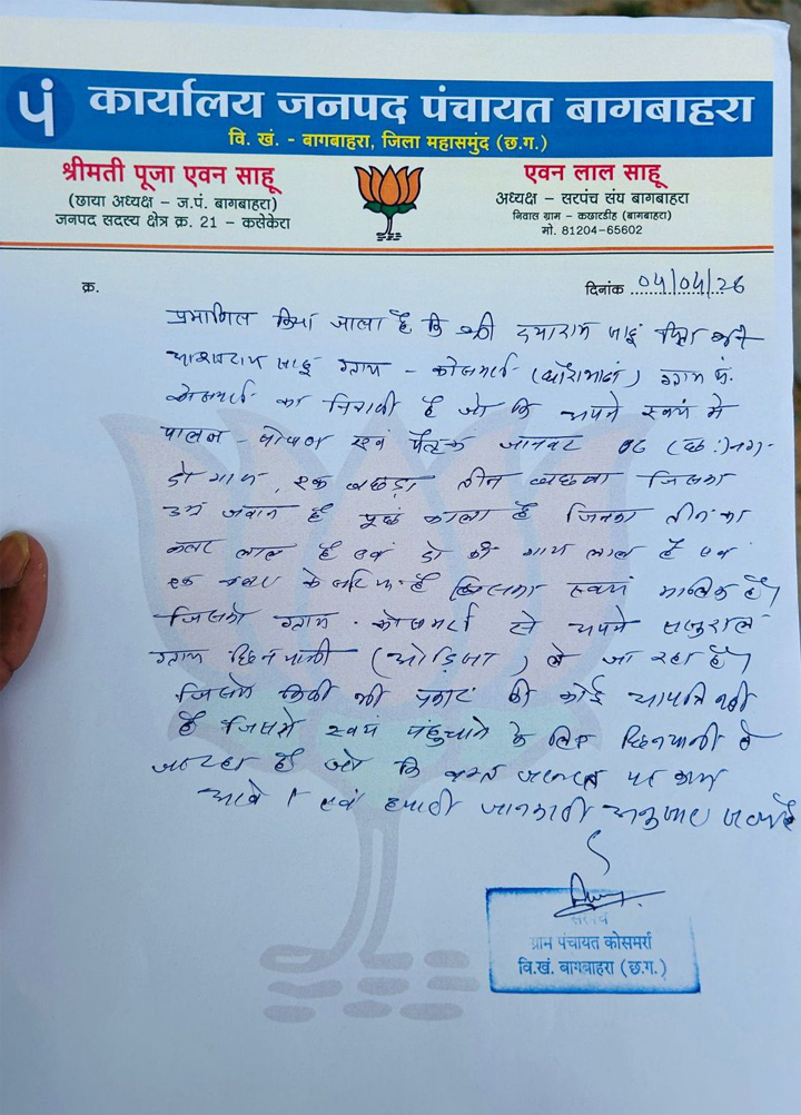 लेटरहेड पर जनपद पंचायत बागबाहरा से जुड़े जनप्रतिनिधियों के नाम—श्रीमती पूजा साहू (जनपद सदस्य) और एवन लाल साहू (अध्यक्ष, सरपंच संघ)—मुद्रित बताए जा रहे हैं, जबकि पत्र में हस्ताक्षर व सील ग्राम पंचायत स्तर के प्रतीत हो रहे हैं।
